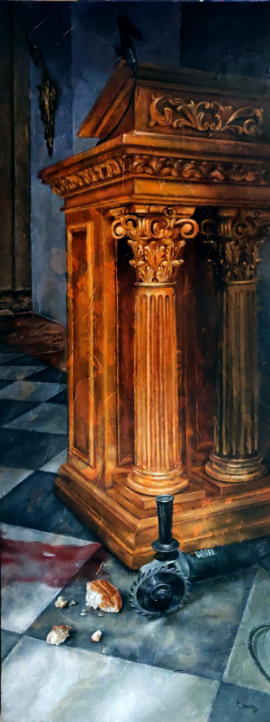 La inmersión en la crítica a esta institución milenaria trata de canalizar una especie de inverso exorcismo y se centra en el Pecado. El Pecado en dos vertientes, el que protagoniza fruto de la hipocresía, y el que injustamente ha vertido en sus penitentes, concretamente en la mujer.